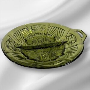 Beautiful Vintage Green Glass Divided Dish Footed Relish Round Tray w/Handle