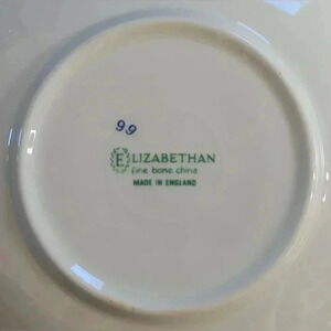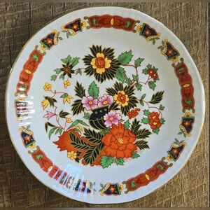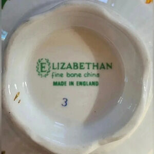 This vintage fine bone china teacup and saucer made in England by Elizabethan is in mint condition and is absolutely gorgeous. The teacup is 2-3/8" tall and is 3-3/8" in diameter. The saucer is 5-9/16" in diameter. This set features a beautiful Oriental floral design in black, yellow, pink, yellow, lavender, and a rich rust color. The cup and saucer both have gold trim. It's an exquisite set!