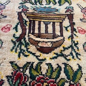 Very unique and beautiful design. Perfect statement piece. Soft with some distressing, edge drifting, and discoloring typical of vintage rugs.