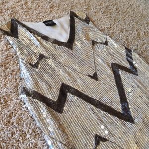 Vintage score! This bronze/silver shift dress has been shortened to cocktail length! Size medium- fits like a size 8. Loose and free flowing. Amazing New Years or special occasion dress!