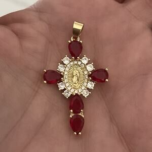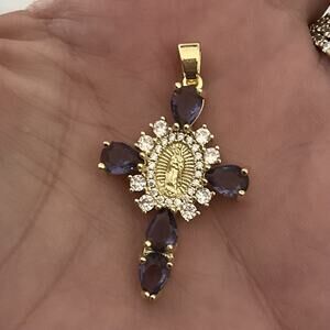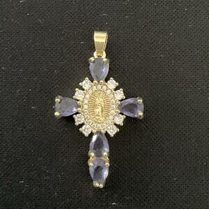 This beautiful Virgin Mary cross pendant features a cross shape design with your choice of gemstone color for the main stone. It is made of yellow gold plated sterling silver with a 925 metal purity, and adorned with cubic zirconia stones. The pendant is perfect for a birthday occasion or for religious-themed jewelry, and can be customized to fit individual preferences. With a fancy colored diamond intensity and a religious theme, this pendant is a lovely and meaningful piece that has never been worn. This purchase is for pendant only.