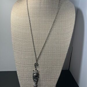 We love this brooch with its stately tiger walking forward. Perfect condition. Tiger is 3” tall. Necklace chain is 27” overall. WA310