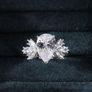 Beautiful Water Drop With Leaf Crystal Pure CZ Silver Pear Wedding Ring, K800