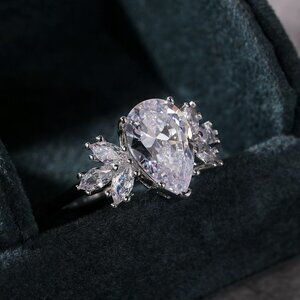 🌸Beautiful Water Drop With Leaf Crystal Pure CZ Silver Pear Wedding Ring, K800