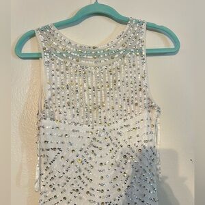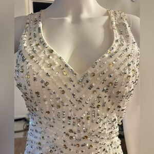 This beautiful dress is by cache, it's full length white in color with silver and gold sequins. It's a size 6 and it has a mermaid style bottom. I do see a tew sequins missing on it in places but still a fabulous dress.