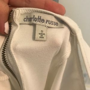 This beautiful white dress is so flattering. Bought it from Charlotte Russe. The dress feels pretty thick and is made of 67% rayon, 28% nylon, 5% spandex. The lining is 100% polyester. It has only been worm maybe three times. And it's definitely not see-through. No stains or the imperfections. For reference I am on the shorter side and this dress falls just above my knees.