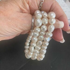 This elegant white pearl bracelet set of 3 adds a touch of sophistication to any outfit. Perfect for any occasion. Size 8 and stretchy.