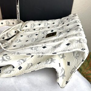 The bag features white handles/straps and hardware, which complement the bag's overall design. The interior lining color is also white, and the bag is made of durable PVC exterior material. This MCM bag is a must-have for any fashionista who wants to make a statement with their accessories.