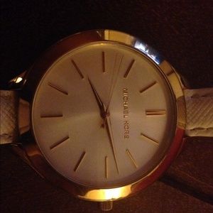 Beautiful! White and gold Michael Kors watch. Only used for less then a year a good possibly 7/8 times. No scratches on watch. The strap has some wear. Could easily replace for 8$ at a store. Lovely piece! Bought in NYC at their store! Have yet to see another white one!
