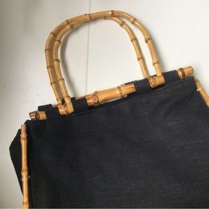 Beautiful Women’s Black Canvas/Linen Bamboo Handles Hand Bag Medium Size