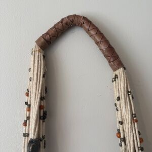 Gorgeous and unique woven purse with long beaded strap with leather for ease of use on your shoulder. Snap closure and elastic opening to secure your belongings.