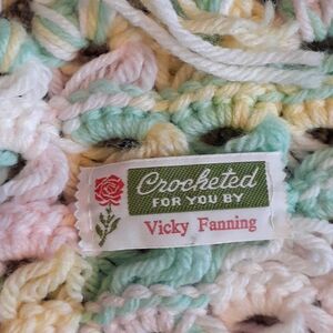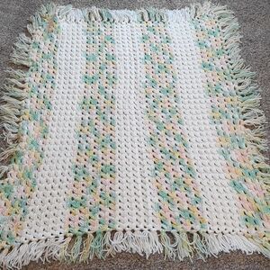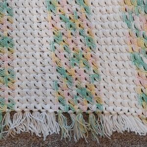 Beautiful afghan - green, yellow, pink, and white with long fringe along outside. Measures 40" W. X 49" L. Very soft. In excellent preowned condition. Hand crocheted. Machine washable