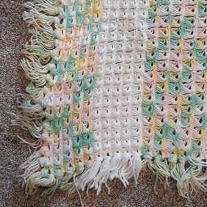 Beautiful afgan - green, yellow, pink, and white with long fringe along outside