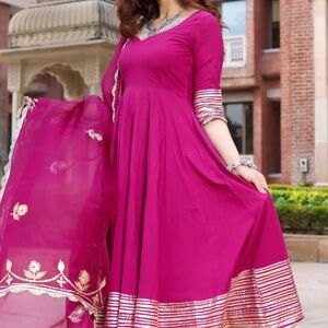 Its 3 piece as shown in picture. Purple- pure cotton. Very high quality. Lots of gher ! Size is medium
