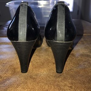 Black patent leather peep toe heels with ribbon detail. Wore to church a few times for special occasions. Comfortable and classy all the way.