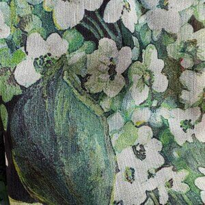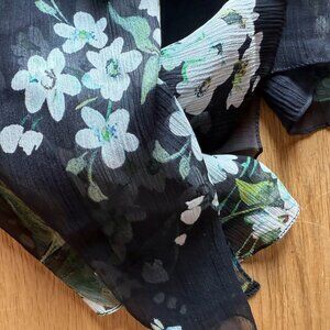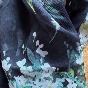 This large silk scarf or stole is in a lovely featherweight sheer black silk, embellished with an abundance of little white flowers.