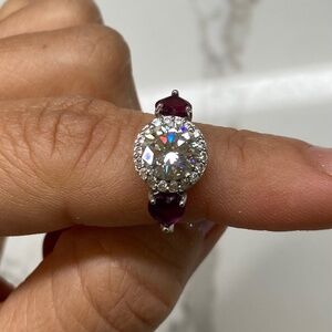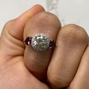 Halo ring - 2.7 grams; 14 karat white gold; 7.4mm Moissanite Fire; Moissanite halo; features beautiful purple heart garnet gemstones on the sides; 1.5 CT equivalent. Appraised at $500. Worn for less than a year.