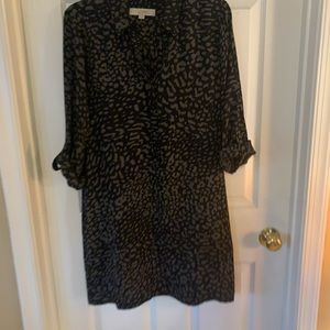 Beautiful black animal print button-down dress with three-quarters sleeves with buttons. Falls just above the knees. Looks awesome with heels or boots!