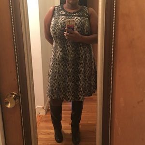 Sleeveless dress can be worn all seasons. Has leather accents around collar and shoulder. The cut really compliments the bodies shape. Has stretch to it so it can be worn at multiple sizes. Polyester, rayon and spandex blend. This dress is gorgeous!