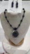 Matching necklace & earring set. Beautiful dark blue and black glass pendant has different patterns front and back for versatility. Hand painted with a navy lace/wave pattern. Clasps are Silver. Beautiful beadwork stationed along the necklace and the beaded earrings. It’s hard to find the full matching set.