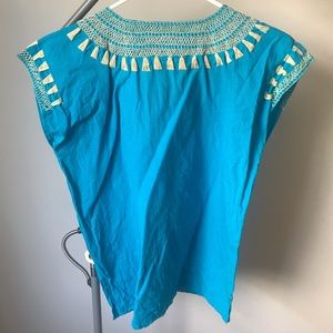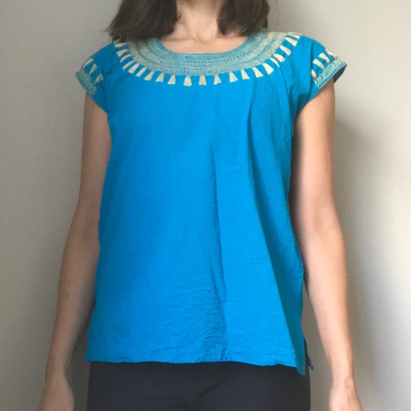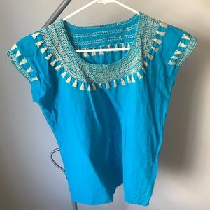 Beautiful blue top purchased in Mexico - has hand-embroidered design along the neck and sleeves. Excellent condition, only worn once. No tag but I would estimate a size small-medium.
