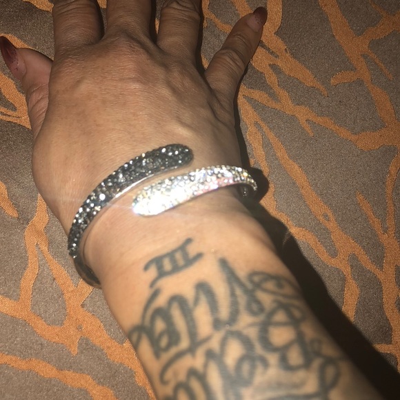 Black and white Swarovski crystal bangle. Traded w a posh sister a while back never used lost the box it came in but I’ll definitely put it in a box 📦 trade for semiprecious stone ring look at iso trade value higher make your own bundle for my iso Celine duffle Celine oversized bag Baumain glasses miumiu perfume new blue n red bottle pink track suits lv Chanel