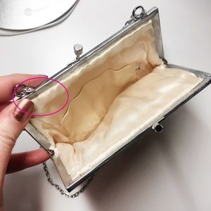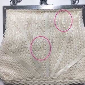 For sale is a beautiful, small beaded bag. Would be a great "something borrowed" for a bride to keep some lipstick and cash in. It is likely vintage based on the style and that I found it in my Grandma's collection of bags, but I cannot confirm that. There are a few small imperfections in coloring and beading, which I tried to point out most of them in the photos, but overall it is a very beautiful bag and the average person would not notice the imperfections while casually looking at the bag.