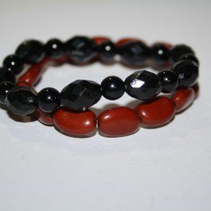 This is a beautiful black and brown bracelet set. The bracelets are 7" long and elastic for easy on and off.
