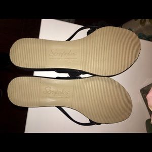 Black sandals with 3 flowers on top and diamonds (imitation) on the side. Never been worn . Great with shorts , dress etc. Really comfy!