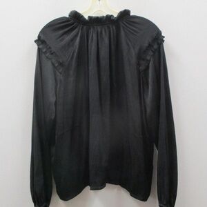 Beautiful black silky blouse. Peasant design with cute ruffle detail and tie. Perfect wardrobe staple to ad to any outfit. Like new condition.