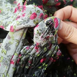 Cheery fusia flowers with black and gray shade accents. Expandable waist area. There's a bow you can tie to your liking. See through material. Perfect for wearing over a cami/tank and makes a perfect spring/summer outfit. Small tear near the bow.