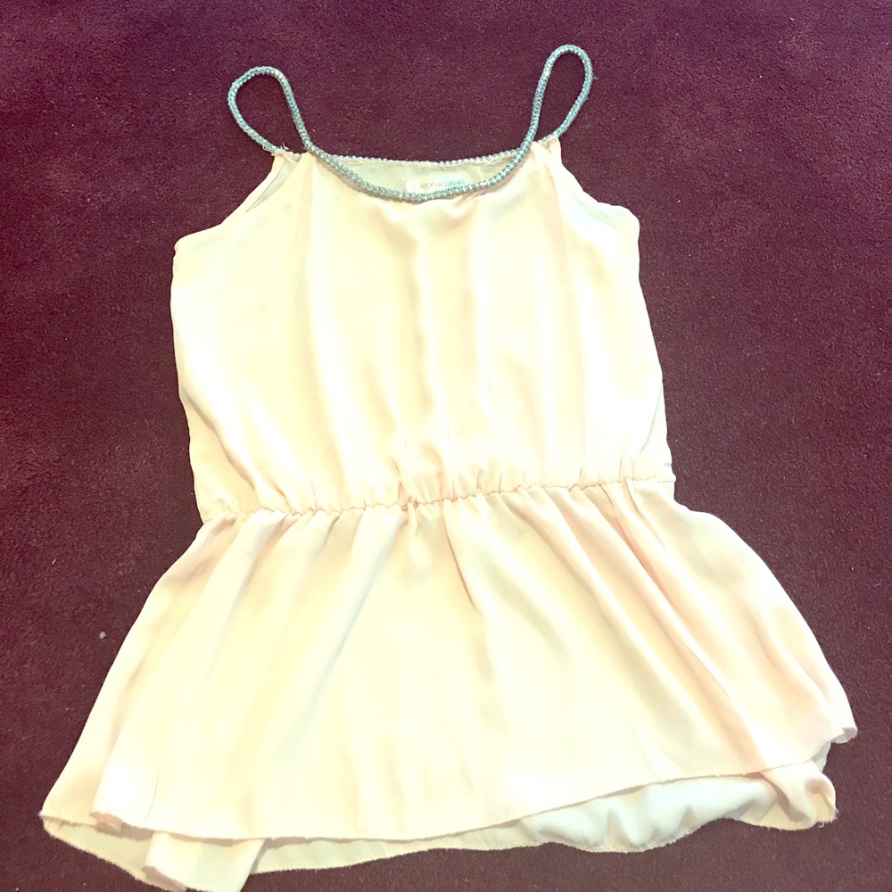 Beautiful chiffon type material blouse with a very light peachy color and bling straps! As you can see in last photo you can see through the shirt. Make me an Offer .