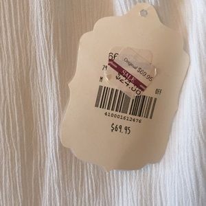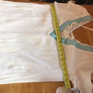 The blouse is off-white with a beautiful embroider around the neckline. The material is like Indian cotton fabric. The length from shoulder to bottom is approx 33 inches. The sleeves are approx 19 inches from shoulder to bottom.
