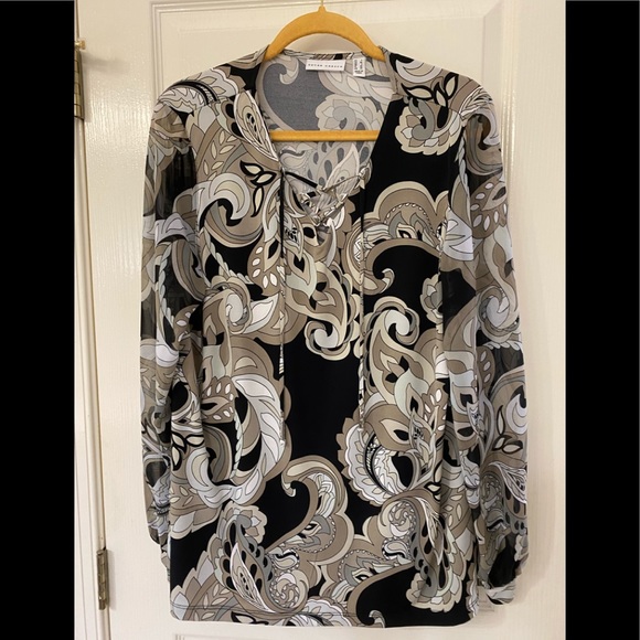 Black, grey and brown paisley print blouse. Neckline has lace-up ties with jewelry finish. Semi-sheer sleeves. By Susan Graver in liquid knit.