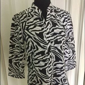 Black and white blouse that's sort of wrinkled. Zebra like stripes. 55% cotton and 45% polyester. Part of elastic in the back.