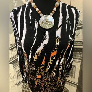 Beautiful top by Peter Nygard in size medium Petite. Form fitting. Open woven sleeves. 55% cotton and 45% rayon. Gentle used condition.