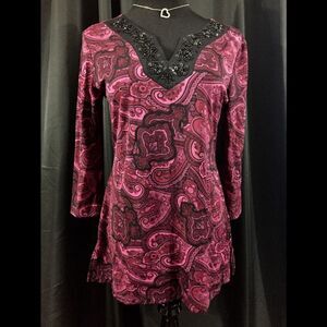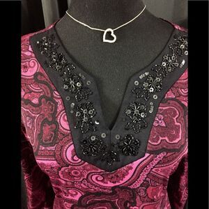 Beautiful blouse by Style &Co in size medium. Nice raspberry color with black embellishment. 100% nylon.