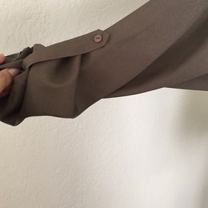 Elegant taupe blouse with stand up collar and with option to roll up to 3/4 sleeves. Necklace not included.