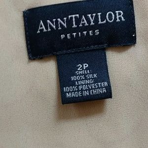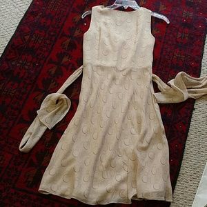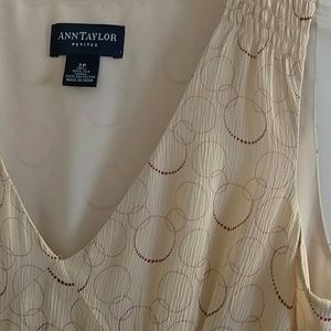 This is a vintage Ann Taylor blush/cream colored silk dress with a mauve circular design. Sheer silk over polyester lining. In excellent pre-loved condition with no noticable flaws.