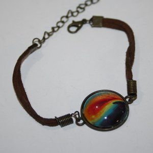 This is a beautiful bracelet with brown cord and bronze. The center is very colorful.