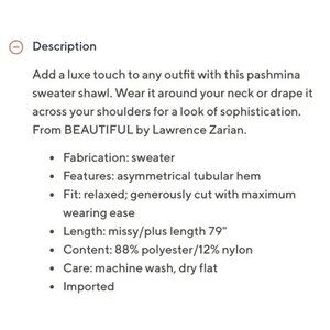 Wrap yourself in the luxurious warmth of the Beautiful by Lawrence Zarian Pashmina Sweater Shawl, a versatile addition to any wardrobe. The solid Mountain Green hue offers a pop of color that's easy to coordinate with a variety of outfits, whether you're dressing for business, a casual outing, a cocktail party, or travel. The 3/4 sleeves and relaxed fit provide a comfortable, flattering drape for everyone.
