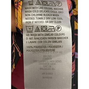 Vibrant multicolor (yellow, pink, orange, purple) floral tropical print on a black base
