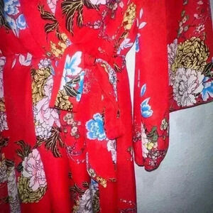 This is a red floral dress with a V-neck and 3/4 sleeves. It has a tie at the waist and is made of 100% polyester. The dress is in pre-owned condition.
