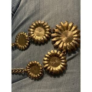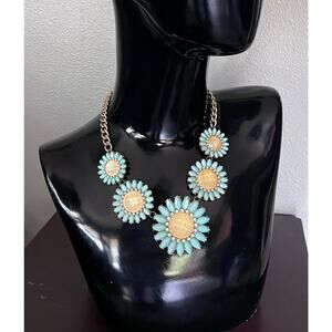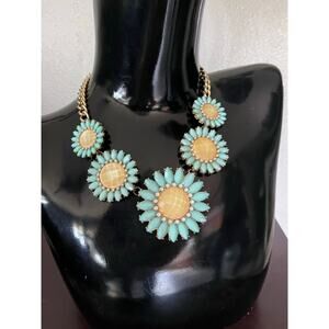Gorgeous beaded floral necklace with seafoam green colored beads, as well as large yellow faceted beads. Gold tone, chunky chain, claw clasp closure.