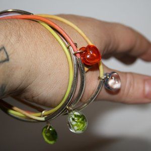 This is a beautiful set of colorful and silver tone bracelets. The Bracelets each have a different charm. They fit my 7" wrist loosely.