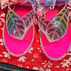 colorful, blingy slides. comfortable, easy to put on with a sundress, and adds Sparkle to any outfit! worn once! Beautiful Bling, High shine, very stylish and eye catching!!!!