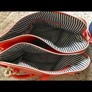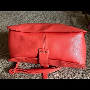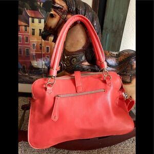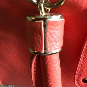 Beautiful man made coral bag by Just Fab. It’s a very roomy bag in a beautiful color. One zippered compartment outside and one inside. Some of the material on inside side of the handle is a little loose, see picture. Besides that it’s in great condition.