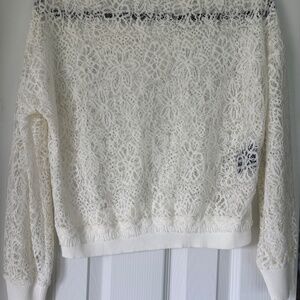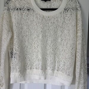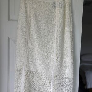 Very feminine, great fit, beautiful eyelet fabric. skirt fitted , pencil and just below knees. top slightly sheer, need ivory camisole