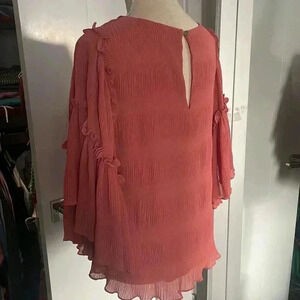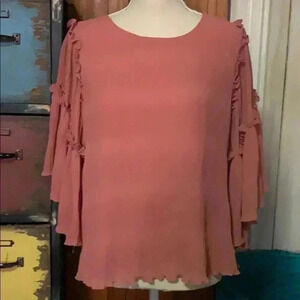 1.State beautiful wide sleeve crinkled ruffled blouse Perfect condition 100% polyester Hand wash Armhole 9” Shoulder 15” Length 23”