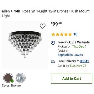Allen + Roth ceiling lamp. Never used, never out of box. Kept in original box since owned. Box has a couple tears nothing more than surface from moving around. Crystals still all safe. Beautiful still in complete package as well.